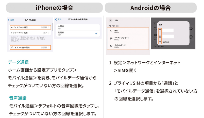 ドコモ回線で音声通話とデータ通信を分けて初期設定を行う必要がある場合があります。iPhoneの場合は「モバイル通信」の設定から、Androidの場合は「SIM」の設定から、音声通話用とデータ通信用の回線をそれぞれ正しく設定してください。