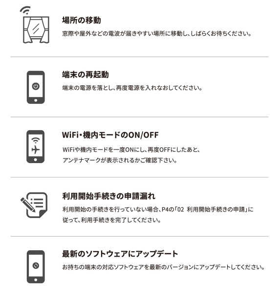 | 機内モードのON/OFF | 機内モードを一度ONにし、再度OFFにしてアンテナマークが表示されるか確認してください。 |