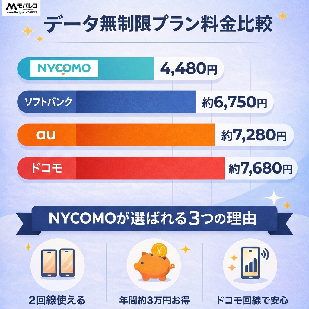 NYCOMOの月額4,928円は、大手キャリアの無制限プランと比較すると約3〜4割も安い価格です。