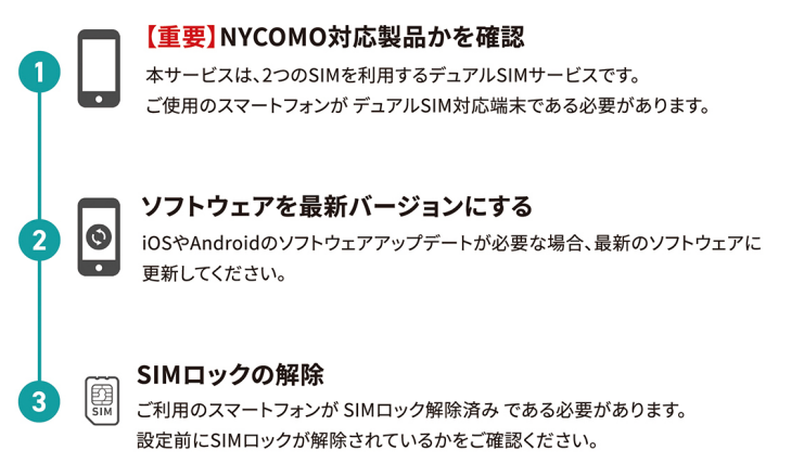 💡 かんたんチェック:iPhoneはXS以降、Androidは近年のモデルであればほとんどがDSDV以上に対応しています。お使いのスマホのスペック表で「DSDV」「DSDA」の記載があれば、NYCOMOを快適に使えます。