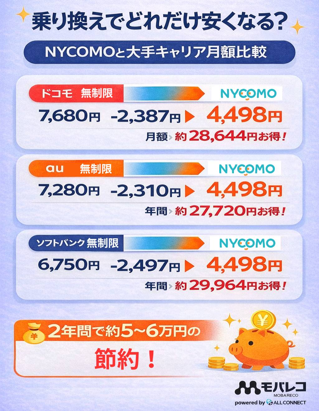 | 乗り換え元 | 月額料金(税込) | NYCOMOとの差額 | 年間節約額 |